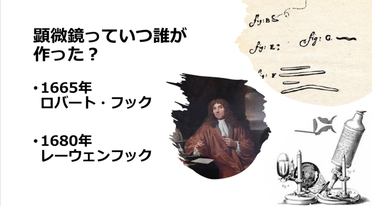それでは、顕微鏡はいつ、誰が作ったのでしょうか。正解はロバート・フックです。彼は1665年に自作の顕微鏡で観察した記録「ミクログラフィア」を発表しました。
