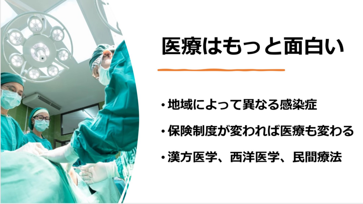 さらに、医療はもっと面白いです。医療には常に医師、患者、保険といった人間生活が関わりますので、医学よりもより人間味があります。保険制度が変われば提供される医療は変わりますし、漢方医学、西洋医学、民間療法といった様々な考え方が見られます。それらを勉強するのも大好きです。