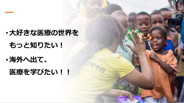 私は、この大好きな医療を日本にとどまらず世界で勉強したいです。