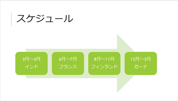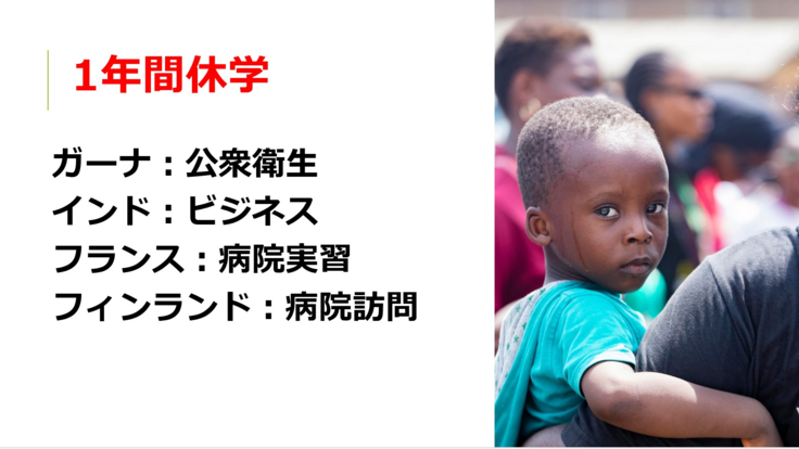 そのために、来年度、1年間休学をします。ガーナ、インド、フランス、フィンランドという経済状況や社会背景が全く異なる4地域を巡り、ビジネスインターンシップや医療ボランティア、病院実習を行います。