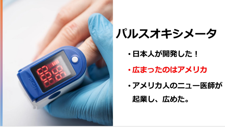 コロナウイルス感染症においても多くの人に使われた「パルスオキシメータ」これを開発したのは、実は日本人です。しかし、パルスオキシメータが最初に普及したのはアメリカでした。アメリカ人の麻酔科医ニュー医師が目を付け、起業して広めたのです。