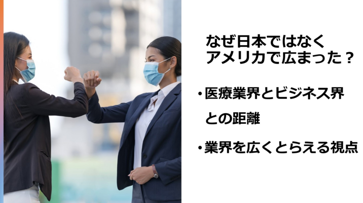 アメリカは日本よりも医療業界とビジネス界との距離が近く、医師が企業をするハードルが低かったから。それにより医療機器が参入しやすかったから。そして、それができたのは、医師が「医療」という業界を病院のみではなく医療ビジネスを含めたより広い視点でとらえていたからです。