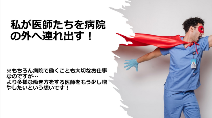 私の夢は、医療ビジネス・ボランティアを含めた広義の医療と、世界の医療を伝える医療の教育者になることです。これらを伝えて、後輩医師たちを病院の外へ連れ出し、彼らの世界を広げ、可能性を広げます。そうして、医師の働き方を多様化させ、医療業界の閉鎖空間を打ち破ります。