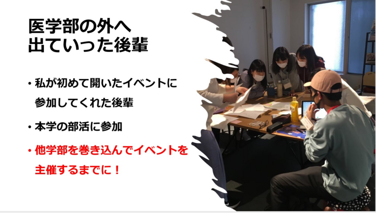 私が初めて開いたイベントに来てくれた後輩です。医学部生は医学部内の部活に入ることがほとんどなのですが、彼女は様々な学部が集まる本学の部活に所属し、今では他学部を巻き込んでイベントを主催するまでになってくれました。