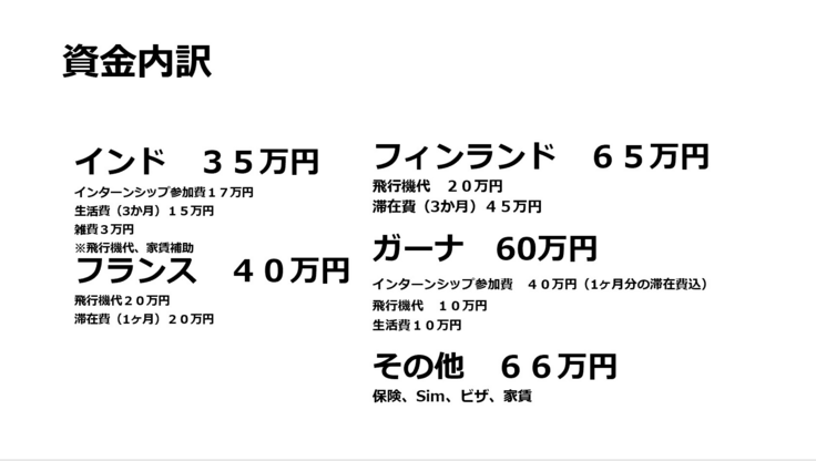留学のために必要な資金が265万円です。そのうち、フィンランドとガーナに必要な125万円は奨学金に申し込んで賄います。