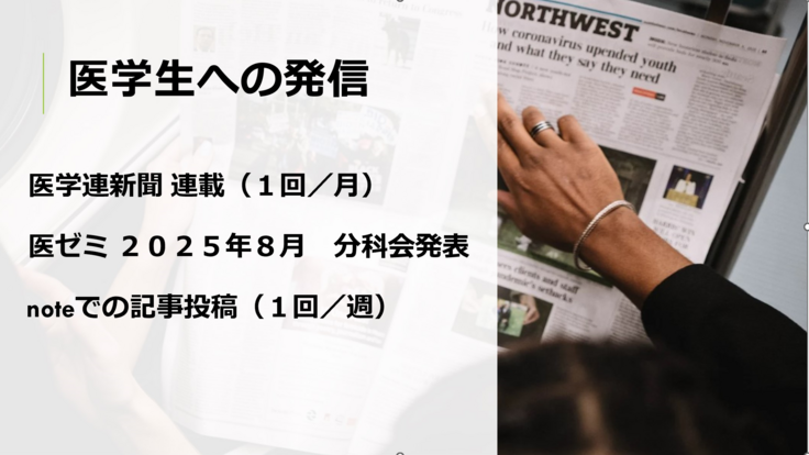 医学生への発信として、医学生が使うメディアでの発信をします。海外での経験で得た知見や考えを活動報告として綴っていきます。