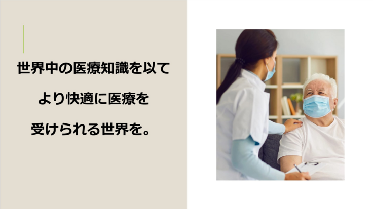 いつか皆さんや、皆さんの大切な人に医療が必要になった時、世界中の医療知識を以て対応させていただきます。そして、皆さんにとってより快適に医療を受けられる世界を創ります。