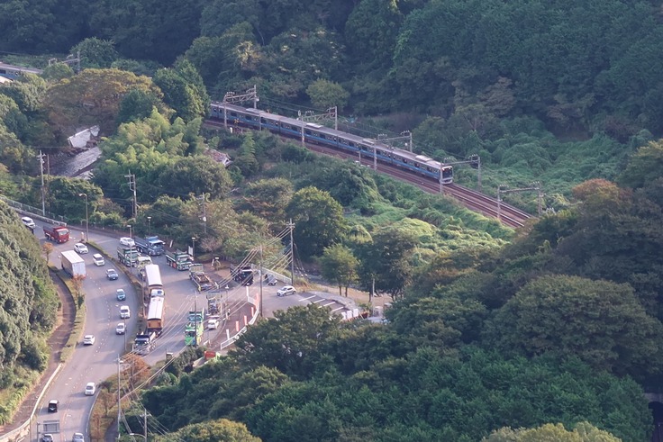 「この電車は新松田から、まえ1両は首都圏電車区行きに、うしろ1両はポッポの丘行きに」