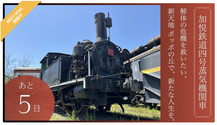 2211号の向かったポッポの丘では、加悦鉄道4号機関車を救うクラファンが第一目標を達成し、第二目標を達成すべくラストスパートを駆け抜けています。(引き続きご支援をお願いします!)