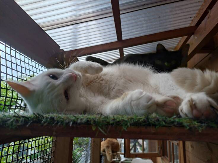 ちなみに、「ハウス」とはホームセンター製作の「木造のログハウス」です。いわゆる「保護猫のシェルター」として使用されており、里親が見つかりにくいFIVやFeLV(白血病)等の感染症に罹患した子を保護する施設です。