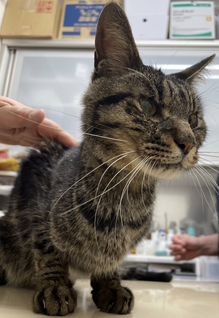 地域の餌やりさんから、栄養失調でガリガリのキジ猫さんが突然現れたと連絡があり、ねこ友会で保護しました。