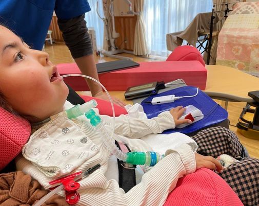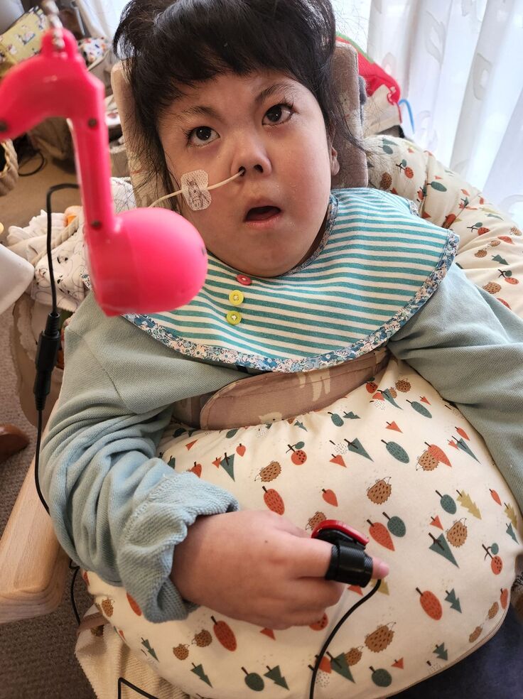 脊髄性筋萎縮症1型で人工呼吸器を装着されているお子さんです。 ハーフスイッチを使い、iPadを操作してカメラや動画、ゲームなどをして楽しんでいます。 ハーフスイッチは、薄くて、小さく、とても軽いです。 マジックテープなどで、好きな土台に固定し、さまざまな姿勢や方向からも設置しやすいそうです。 メリサちゃんは楽々と連打押しなどができ、iPadを上手に使いこなせるようになりました。 そして現在、ファイン・チャットの導入に向けて、練習を頑張っています。 春から小学生になられるので、これからお友だちや先生たちとのコミュニケーションの方法として、たくさん活躍することを願っています。