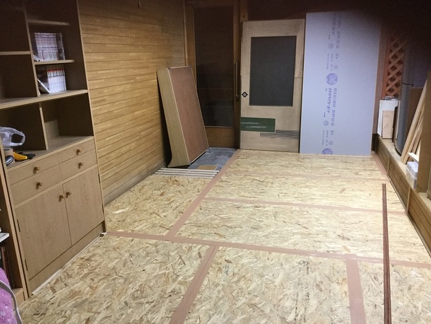 厨房部分をすべて拭き掃除が可能な清潔なスペースとして保つために、新たにドアを設けて、全ての壁を合板で仕上げ、床はウレタンマットで仕上げて、電気もシンクと天井の両方に明るいものを取りつけました。この時に、石油給湯器が使える状態だったことが幸いしました。凍結で割れていた水道管を直して、簡単な浄水器も付ける事が出来ました。