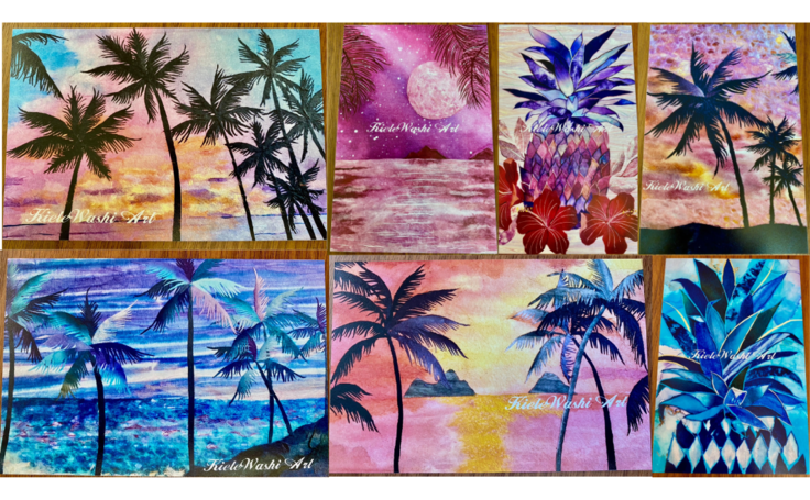 満月やパイナップルなどにはシンボル的な意味があり、それにプラスして使用した和紙の色の持つパワーや象徴、色のイメージを和紙絵画制作の際から意識してタイトルとして付けています。写真たてにいれて、