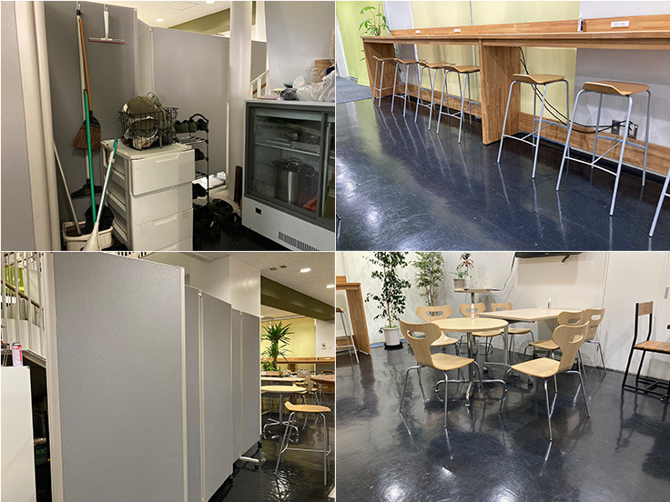 また、現状は授業の合間にアルバイトに入る学生のための控室がなく、大学にあるパーテーションを利用して簡易的に間仕切りをしている状態です。バックヤードやアルバイト学生の休憩スペースとして利用できるように、お客様スペースとスタッフスペースを明確に分けながらも、お店の雰囲気を壊さない間仕切りへ改装します。