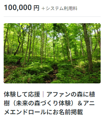 ▶︎<100,000円のコース>体験して応援|アファンの森に植樹(未来の森づくり体験)&アニメエンドロールにお名前掲載をご支援されたい方は、下記の画像をクリックすることで、該当のリターンの支援に移動します。
