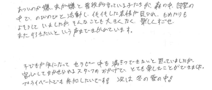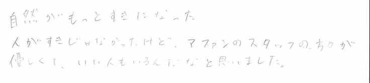 活動後に実施したアンケートでは、アファンの森に来た前と後で、日常の中で見られる姿は特別大きな変化は出ていないようですが、嫌いな虫が少し平気になったとか、少し大きな声で話せるようになったとか、小さな変化は見られていて、アファンの森がきっかけで変われたことの一つと思います。