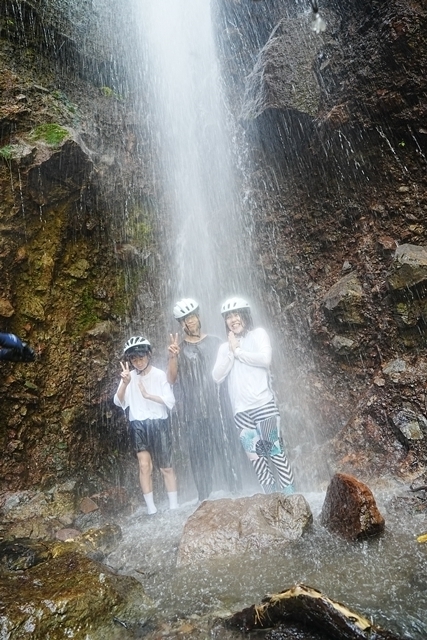 目的地までは、山道を歩き、滝のある場所まで沢登りをすると、修行の滝に到着。