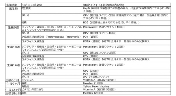 ナイジェリアの予防接種の種類とスケジュールは、以下の表の通りで、日本のものとはちょっと違います。日本の三種混合にさらに2種類加わった五価ワクチンとなっていたり、西アフリカですので黄熱病予防接種が入っていたりします。