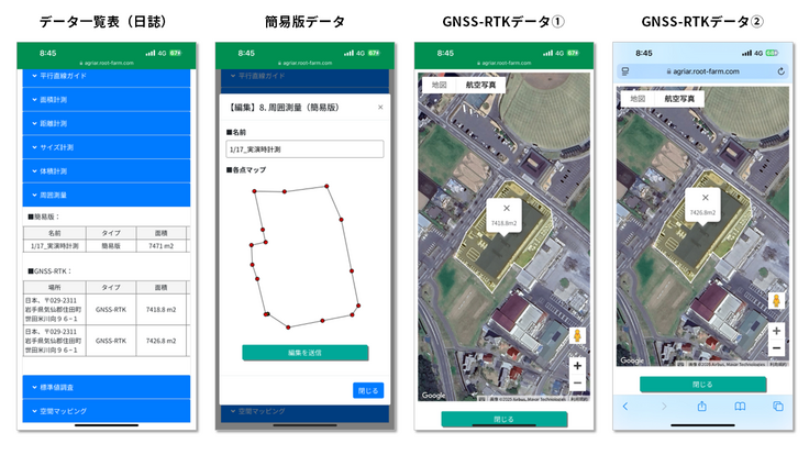 結果、Agri-ARが提供する「簡易版」「GNSS-RTK」の二つの方式での計測値もほぼ合致し、その精度と実用性を確認することができました!!