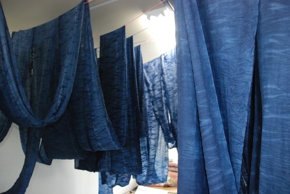 (大量の生地が、藍染教室の中には干してあり鮮やかです。)