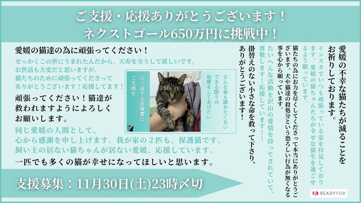 そしてこのクラウドファンディングを通して多くの方々に愛Catの存在及び活動を知っていただくことで、愛媛県で、「殺処分0、野良猫0」を目標に活動を継続させていきたいと思っています。