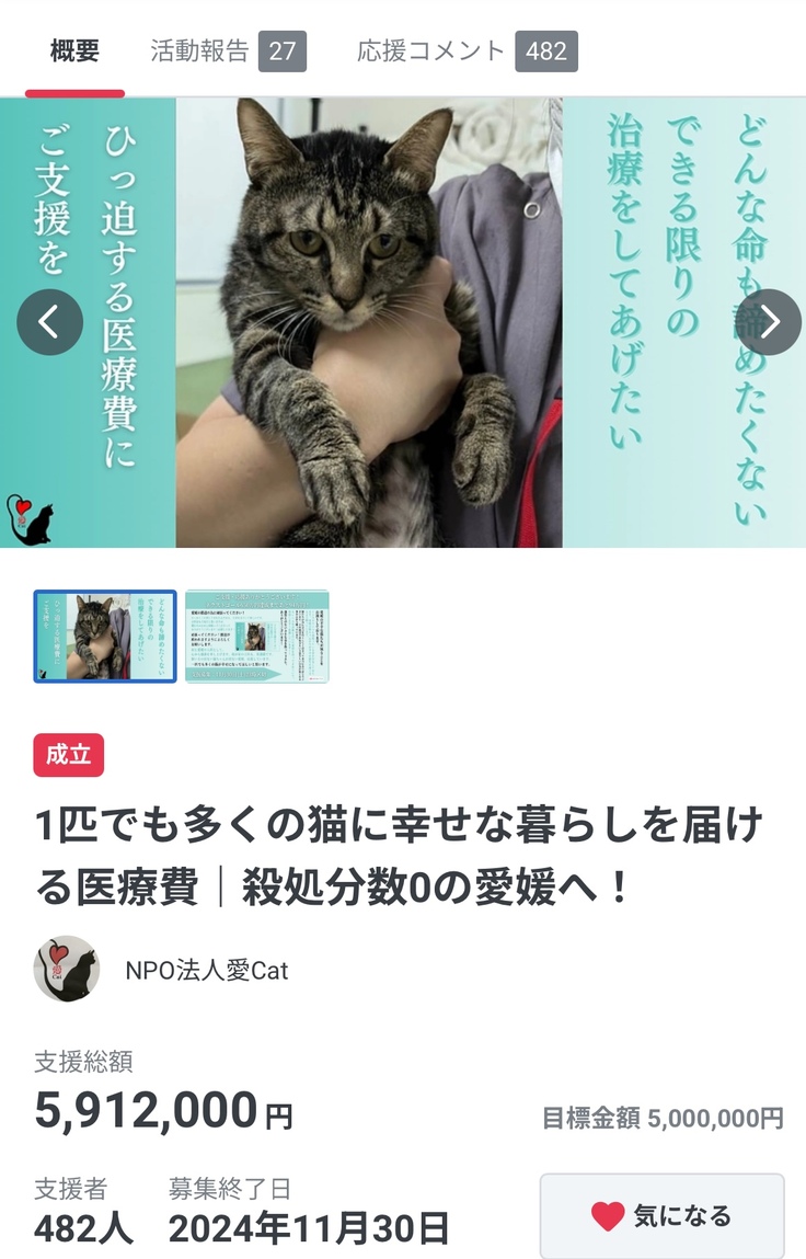 「1匹でも多くの猫に幸せな暮らしを届ける医療費|殺処分数0の愛媛へ!」