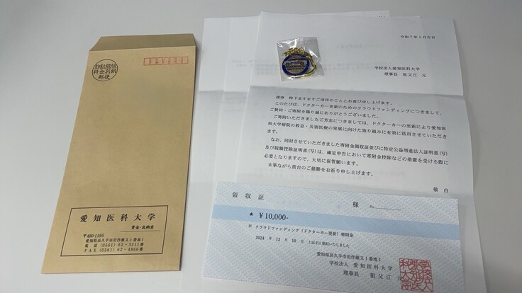 昨日1月17日付けで、いただいたご寄附に対する領収書と、リターンである愛知医科大学ドクターカーのオリジナルキーホルダーを送付いたしました。