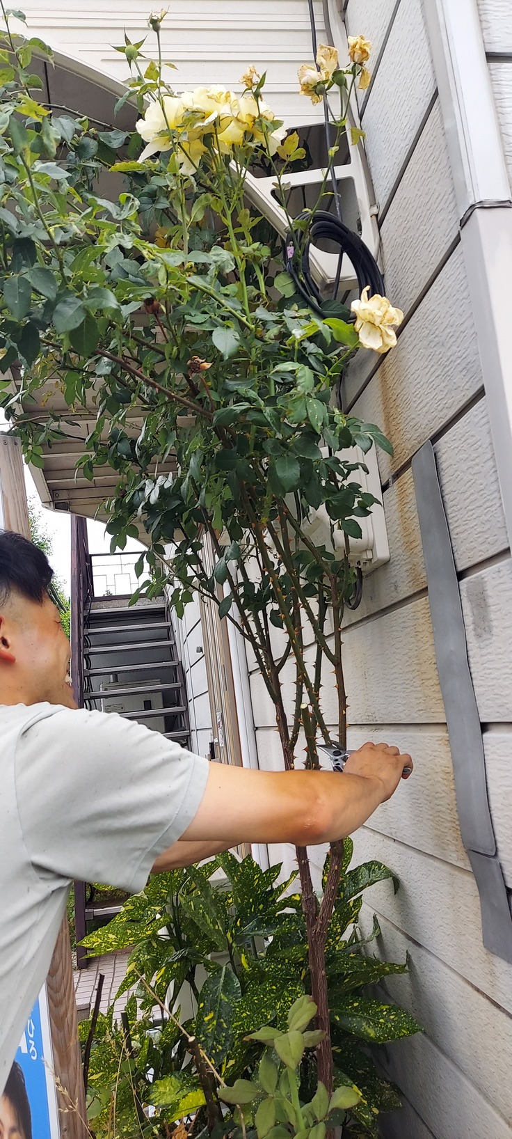 愛ちゃんのご主人はバラを育てるのが趣味とのことで、長らく手入れできていなかった黄色いバラの剪定を✨