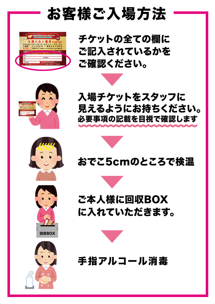 ・入場券に連絡先や当日朝の体温を記入していただく。