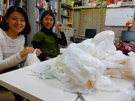 (紙おむつを縫い合わせて、「おむつドレス」制作中)