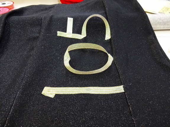 手前の彼女はエプロンに何かを縫い付けていますよ!?)