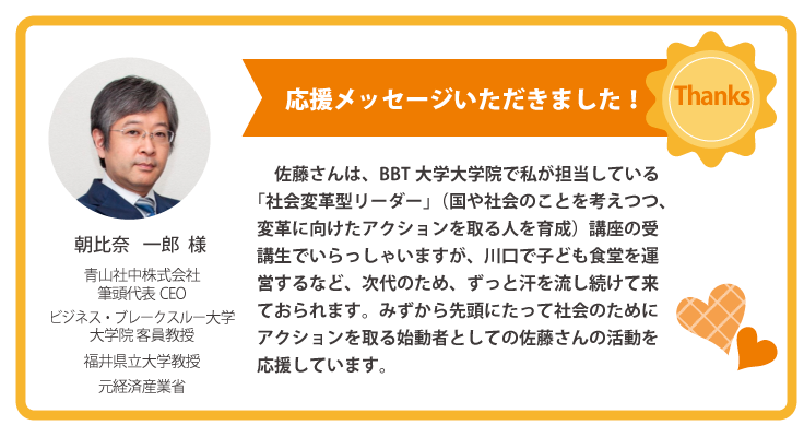青山社中 筆頭代表CEOの朝比奈 一郎 様からの応援メッセージ