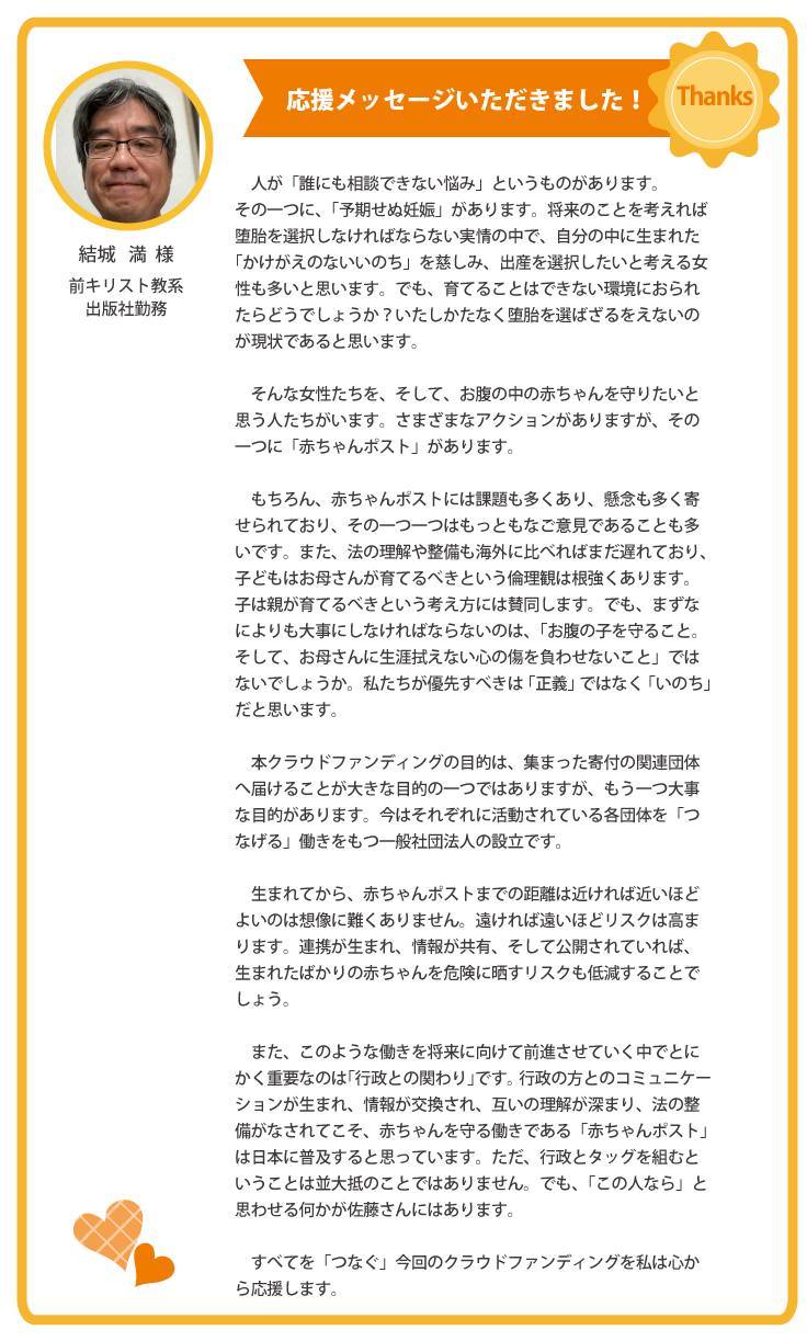 前キリスト教系出版社勤務・結城 満 様からの応援メッセージ