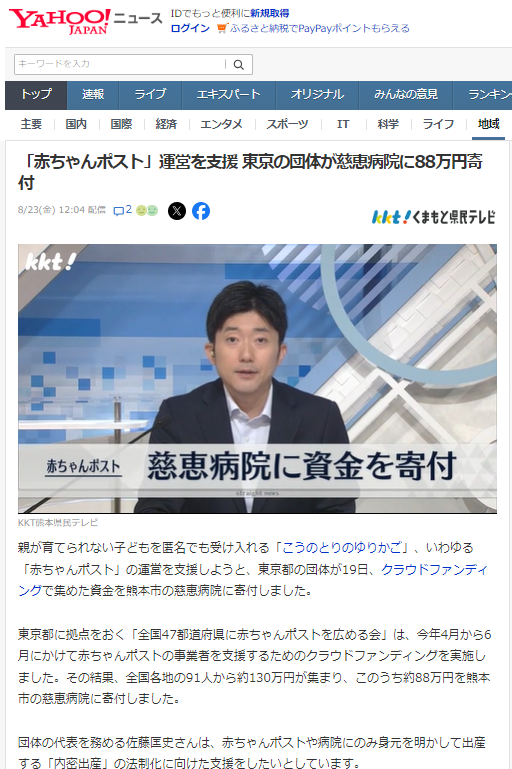 その結果、全国各地の91人から約130万円が集まり、このうち約88万円を熊本市の慈恵病院に寄付しました。 団体の代表を務める佐藤匡史さんは、赤ちゃんポストや病院にのみ身元を明かして出産する「内密出産」の法制化に向けた支援をしたいとしています。