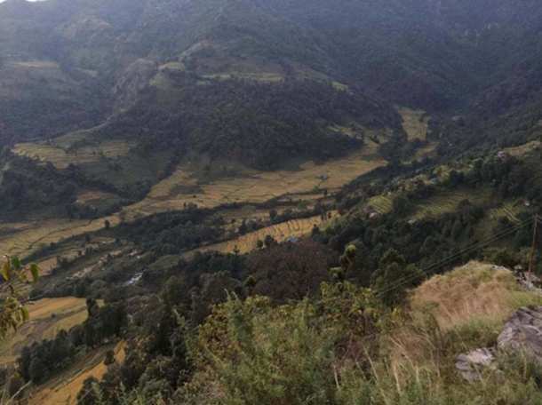 ネパールは山が多いので、起伏が大きい地形を利用した段々畑や棚田がいたるところで作られ、農作や稲作に使われています。村の段々畑ではジャガイモや小麦などを作っているそうです。