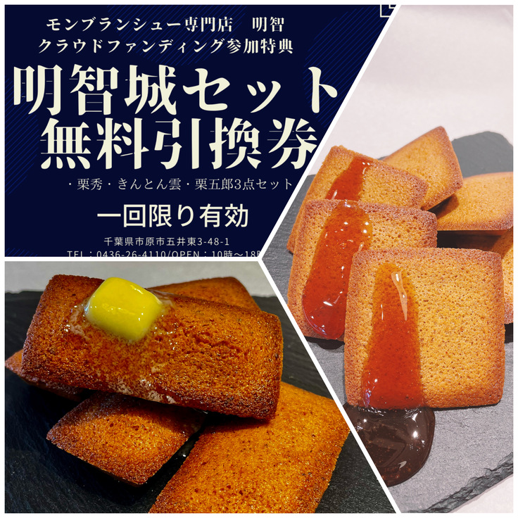 ●フィナンシェギフトorシュークリームセット引換券(明智城セット)どちらかお好きなものを1つお送りさせて頂きます。