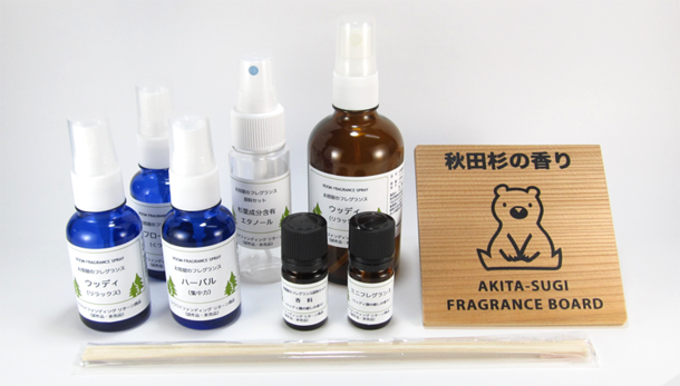 秋田杉ボードやタオル、ティッシュなど、ポタポタと垂らせば手軽に香りを楽しめます。フレグランスは独自に調合した「ウッディ調の癒しの香り」です。フレグランスには杉葉成分が入ったエタノール(試作品用)を使用しています。