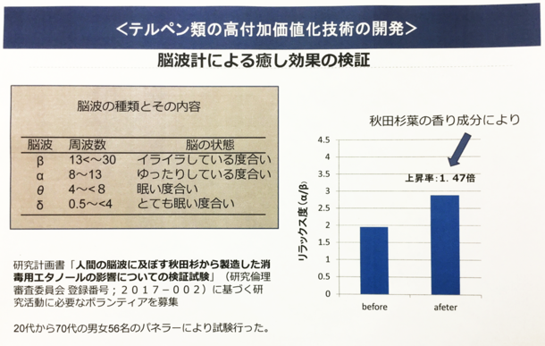 まずは杉葉アルコールを嗅いだ時に人の脳にリラックス効果(α波を出現)を確認できるかを検証し、さらに杉葉アルコールとフレグランス調合した香りにα波を出現させる調香技術を確立することを目指しています。