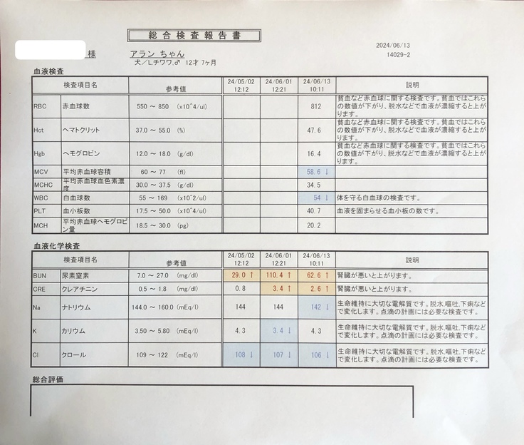 アランの腎臓の数値が、正常値の約3倍以上と、異常に高くなっている結果がでて、ショックを受けた約2週間後の検査です。