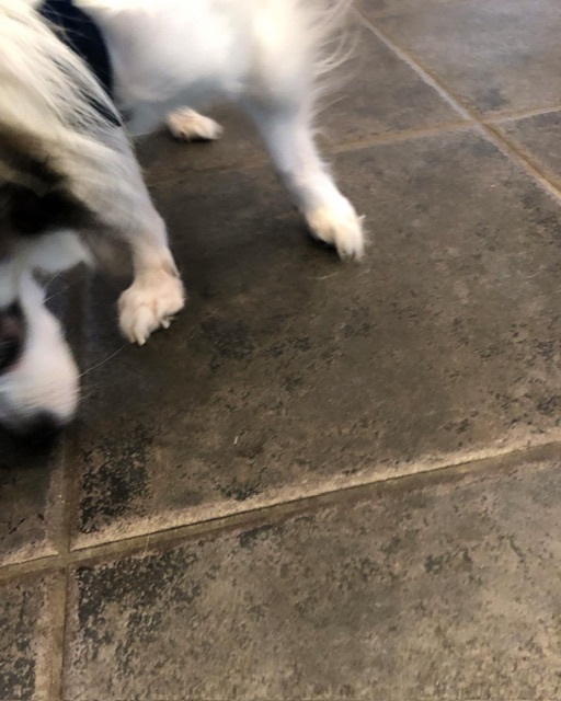 診療受付時間が終了間近の病院の待合には、他の患者さんがおらず私たちだけでしたので、ずっとスリングで抱っこして暑そうにしていたアランを足元に降ろしました。