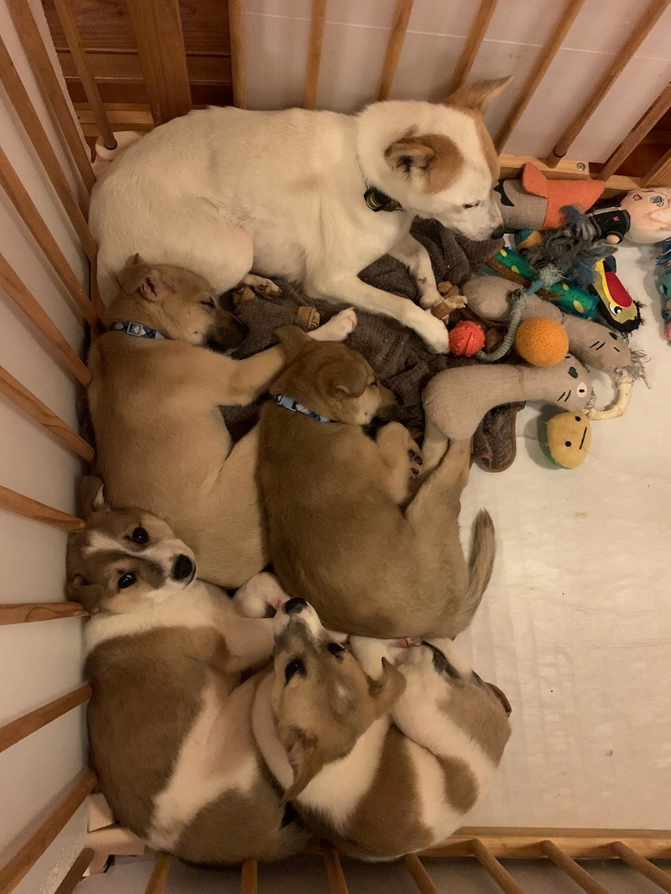 便宜上、母犬に「ひなぎく」、仔犬に「春生、春子、メイ、もう」と名前をつけました。