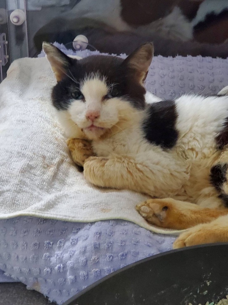 衰弱して動けなくなっていたところを緊急保護した地域猫の雪。