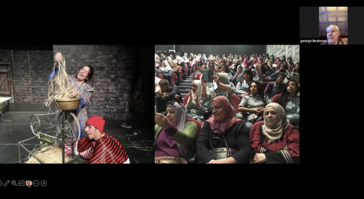 ジョージさんが1960年代から東エルサレムにアルカサバシアターを設立した当初から、どのように現在のラマッラーのアルカサバシアターが重要な文化拠点になっていったかという歴史的変遷を伺いました。津田大介さん、百瀬文さん、高山明さんによるコメントと質問に丁寧に答えていただきながら、私たちはジョージさんの79年のこれまでの人生において、奪われてきた土地、尊厳、自由、時間などの計り知れなさ、その切実な声に心打たれました。
