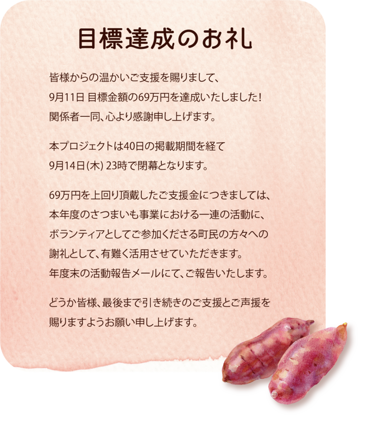 さつまいも栽培事業は住民の皆様にも好評で、これからも長く継続したいと思いますので、どうか皆様のご協力をお願いいたします。