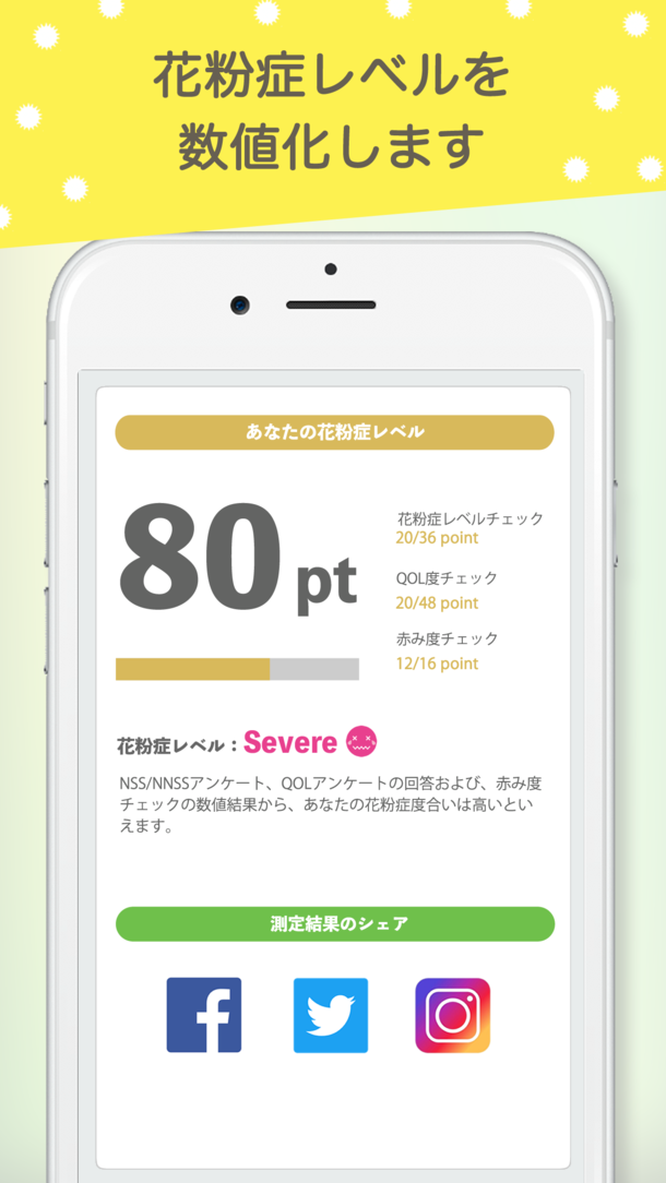 本アプリでは、ユーザー自身の花粉症の自覚症状アンケートや目の赤みの画像診断から花粉症レベルを数値化して示す「花粉症レベルチェック」機能や、どの地域にどのくらいの花粉症レベルの人がいるかを確認できる「みんなの花粉症マップ」、また、花粉症によって影響を及ぼすとされるQOL(Quality of Life:生活の質)や労働生産性などを確認するための花粉症研究に向けたモニタリング機能も搭載することができました。