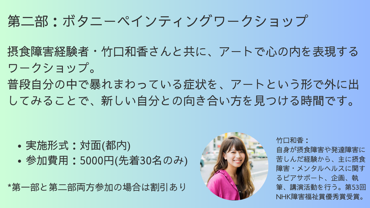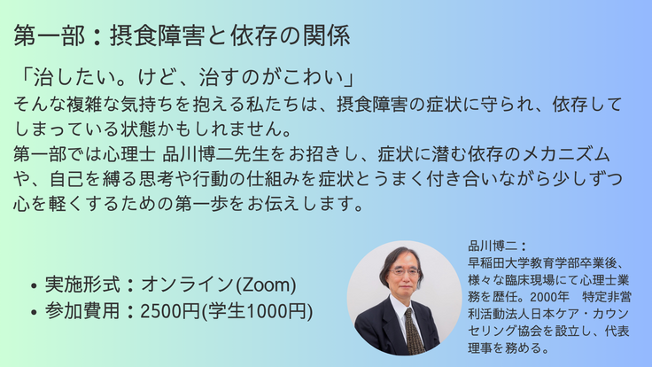 下記のように、前半・後半と二部制のイベントで、それぞれ摂食障害に理解のある講師を招いて開催いたします!