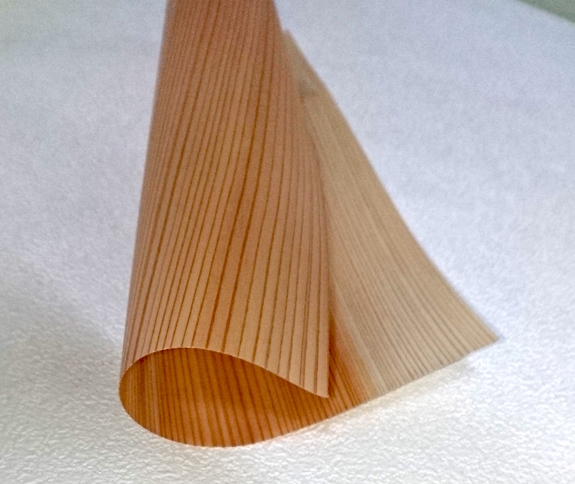 実用化までにかかった歳月は発想からおよそ3年。今では網代では出来ない杉以外の樹種でも製作出来るようになりました。また、板ではなくシート状にすることにより更に汎用性も高めることに成功しました。