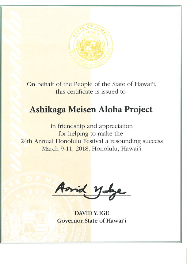 そしてハワイ州知事デビッド・イゲ様からも直々に感謝状を頂き、
