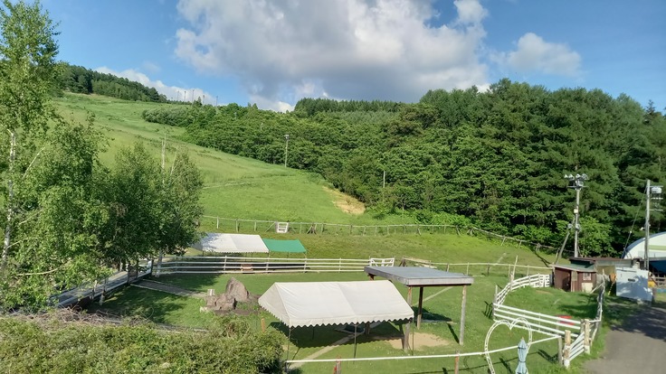 メス柵は日除け屋根に並列して1張り、オス柵は頭数も多いので2張りに。
